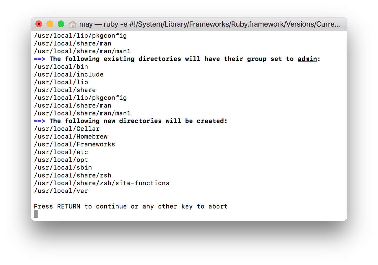 터미널에 /usr/bin/ruby -e "$(curl -fsSL https://raw.githubusercontent.com/Homebrew/install/master/install)"를 입력하고 엔터를 누른다.