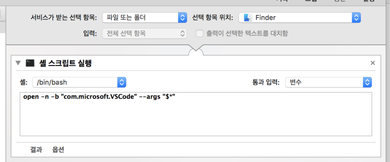 6. 셀 스크립트 실행 세팅 화면에서 "통과 입력: 변수" 선택합니다. 그리고 아래 코드를 복사해서 실행 화면에 붙입니다