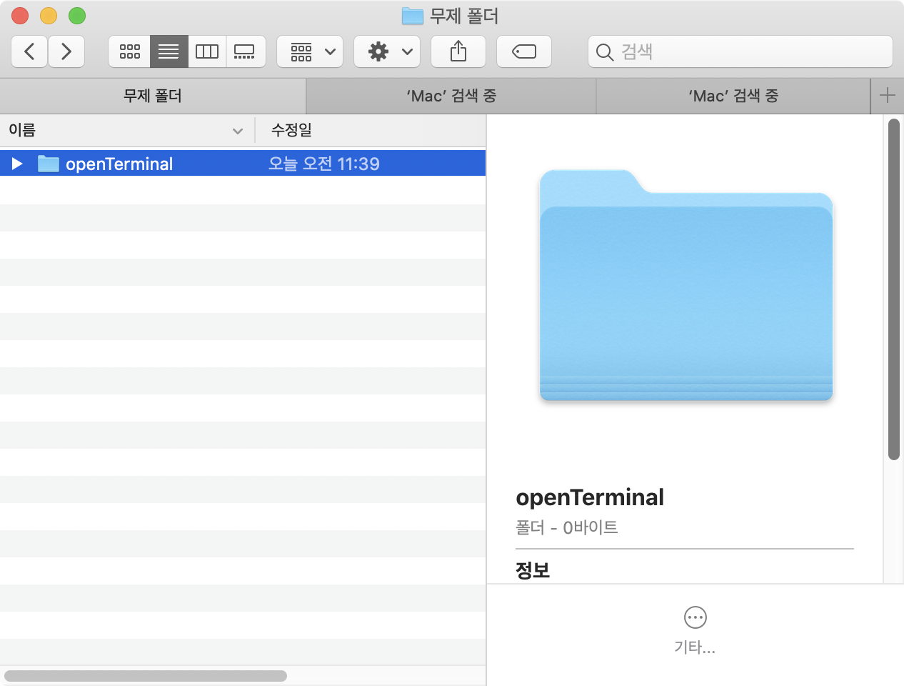 반대로 터미널 실행중 해당 폴더를 파인더에서 바로 여는 방법이 궁금하신 분들은 아래 포스팅을 참고해 주세요^^