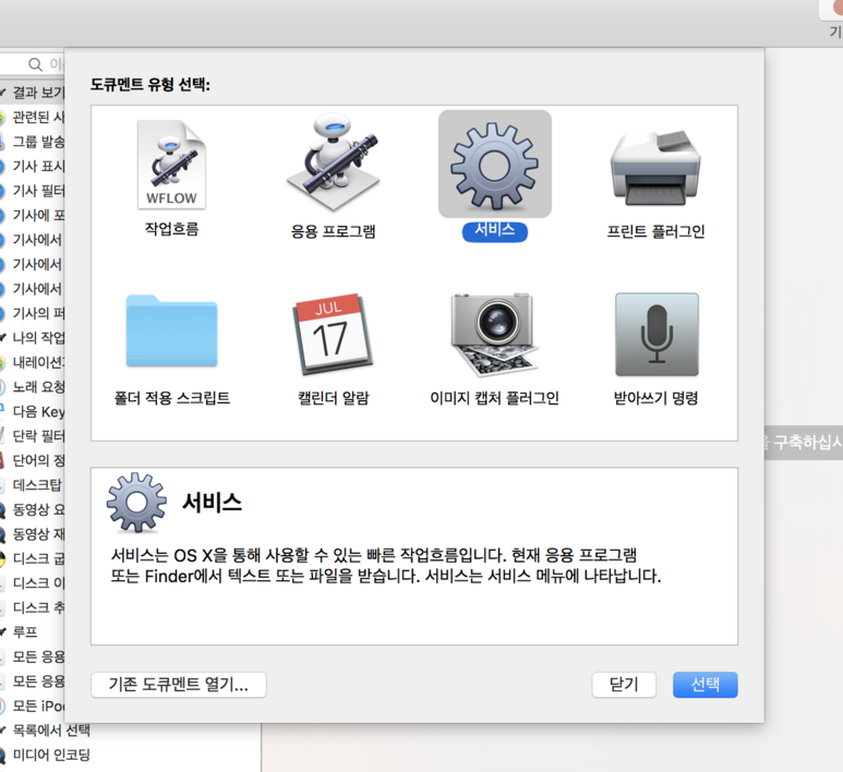 4. "서비스가 받는 선택 항목: 파일 또는 폴더", "선택 항목 위치: Finder"를 선택합니다.