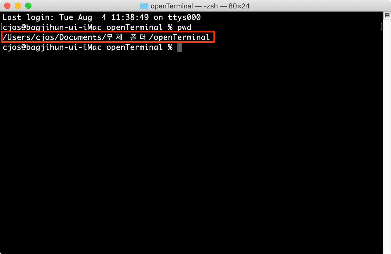 5. 현재 선택한 폴더를 경로로 하여 터미널(Terminal) 앱이 바로 오픈 된 것을 확인 하실 수 있습니다.