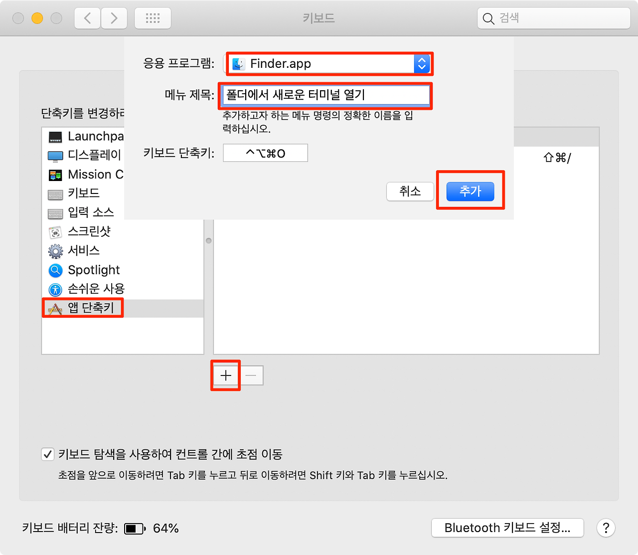 - 앱 단축키 > + 버튼을 눌러 항목 추가 메뉴를 띄운 뒤 응용프로그램에서 파인더(Finder.app)를 선택해주시고 메뉴 제목을 아까 활성화 시켰던 “폴더에서 새로운 터미널 열기” 로 입력하고 키보드 단축키도 동일하게 설정한 뒤 추가해 주세요.