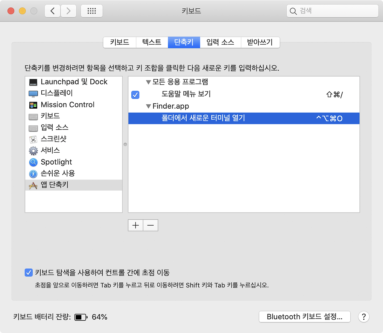 2. 상단에 “단축키” 탭으로 이동하여 서비스 > 폴더에서 새로운 터미널 열기 항목을 활성화 하고 사용할 단축키를 설정해 줍니다. 저는 ⌃⌥⌘+O 로 설정해 주었습니다.