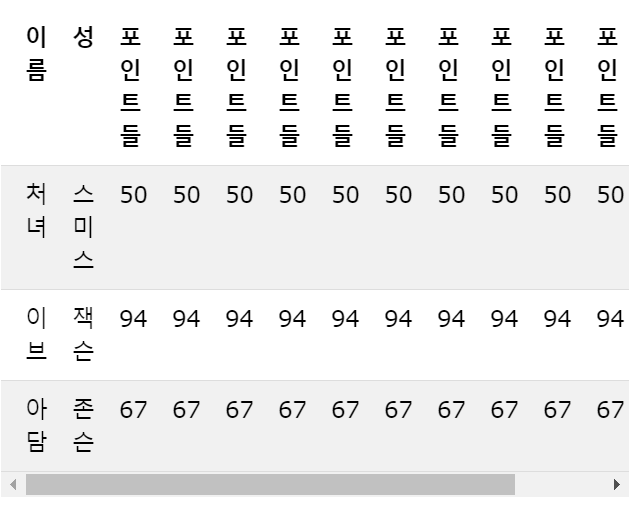 화면이 너무 작아 전체 내용을 표시 할 수없는 경우 반응 형 테이블에 가로 스크롤 막대가 표시됩니다.