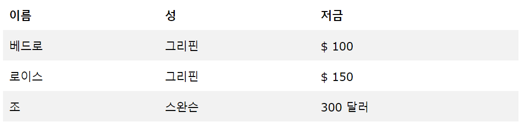 각 테이블 행은 <tr>태그 로 정의됩니다 . 테이블 헤더는 <th>태그 로 정의됩니다 . 기본적으로 테이블 제목은 굵게 표시되고 가운데에 표시됩니다. 테이블 데이터 / 셀은 <td>태그 로 정의됩니다 .