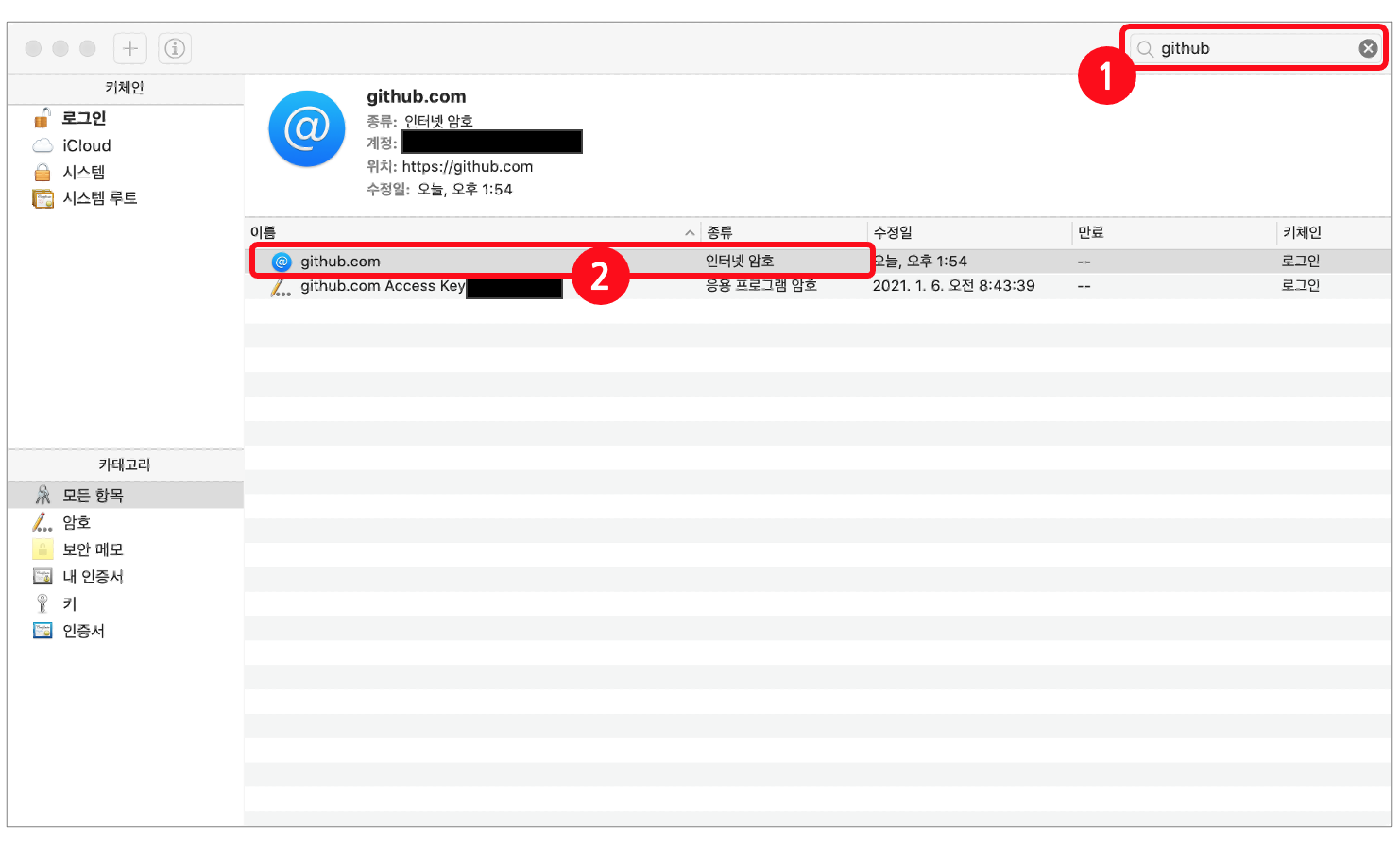 2. "github" 를 검색 후, 종류가 "인터넷암호"인 항목을 더블 클릭