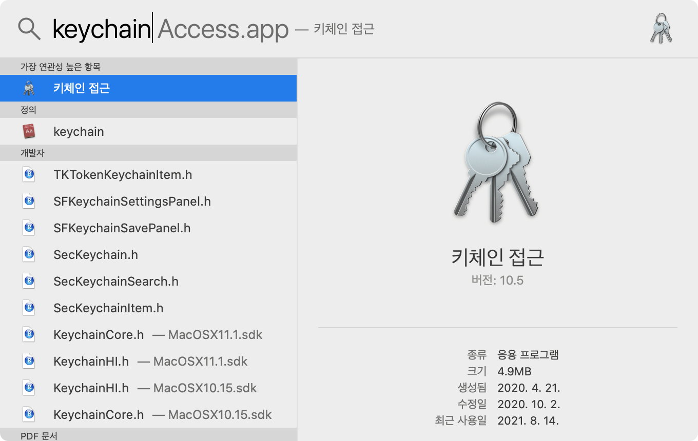 1. Spotlight 검색에서 keychain(키체인 접근)을 찾아서 실행