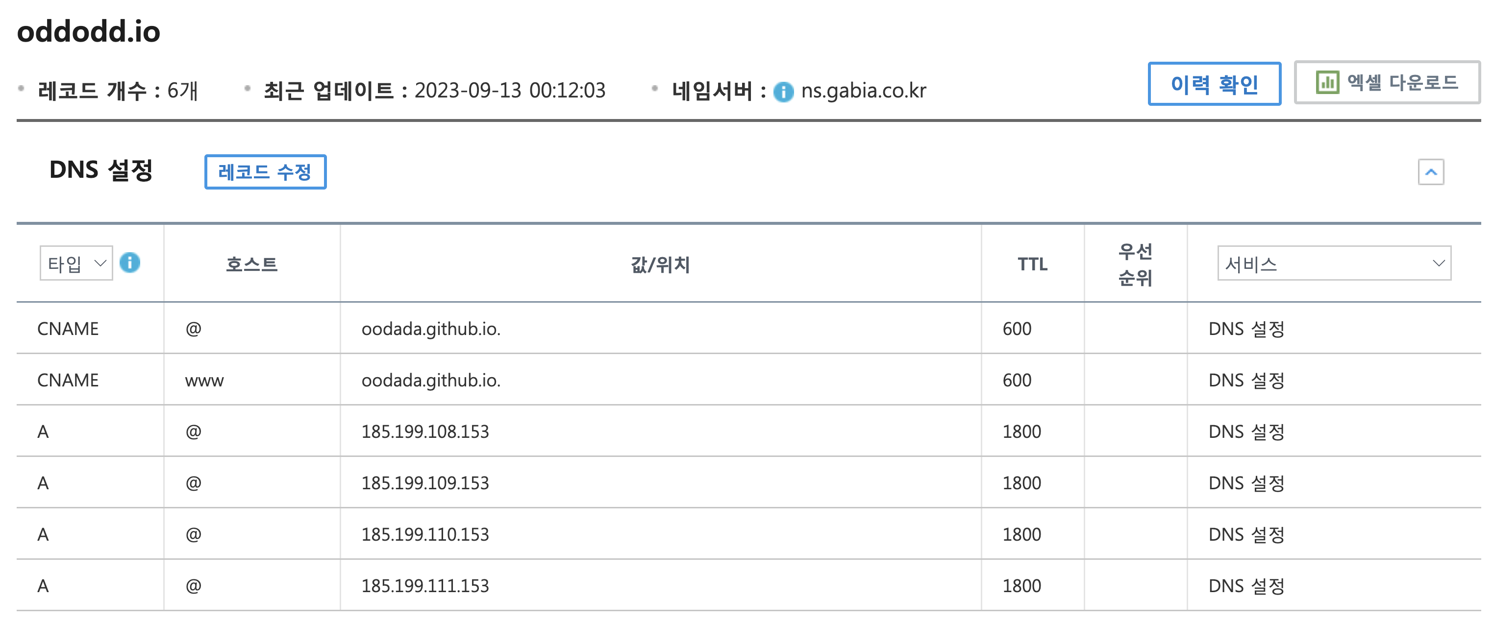 | CNAME | www | 깃헙아이디.github.io. | 600 |