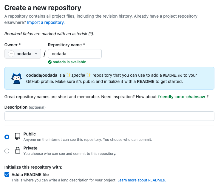 리포지토리 이름은 본인의 아이디와 동일하게 만들면 ✨special✨ repository를 만들 수 있다.