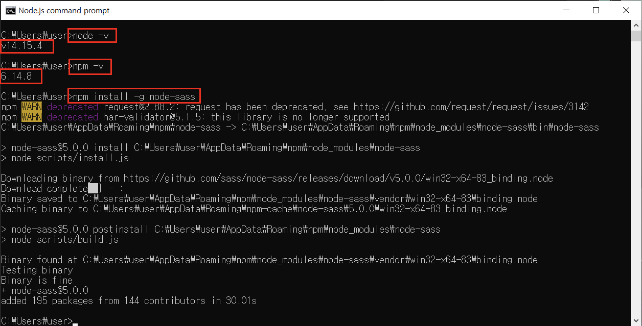 Node.js Command Prompt 창에 아래 명령어를 입력하면 node-sass가 설치됩니다.