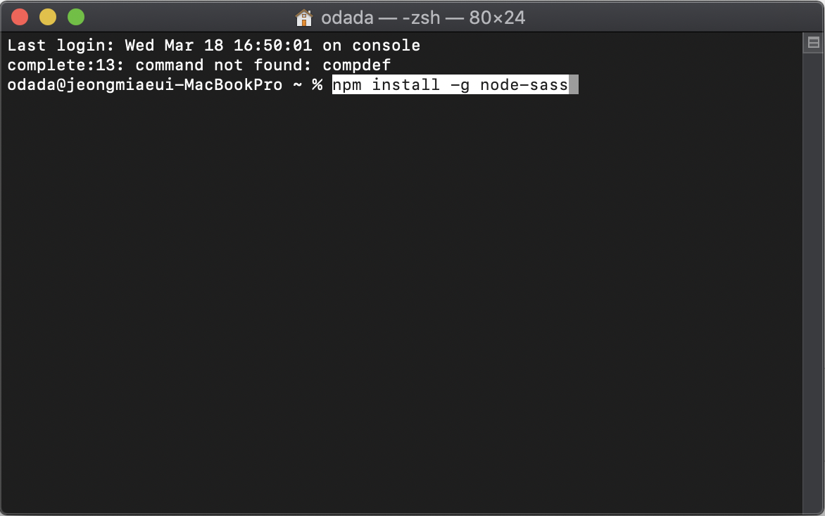 Homebrew, node.js, npm이 설치되어 있지 않으면 설치 후 node-sass를 설치한다.