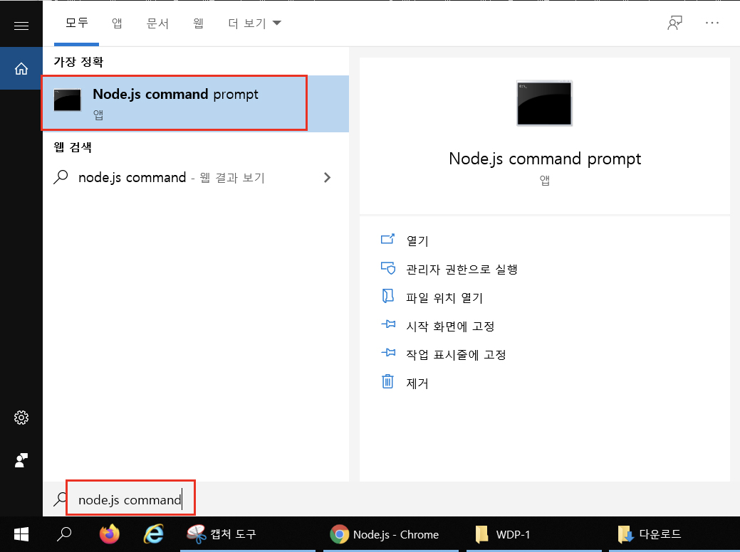 윈도우 검색 (단축키 : 윈도우키+s)으로 Node.js Command Prompt창을 열고