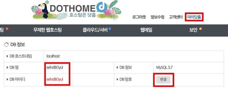 닷홈 > 마이닷홈 > 호스팅관리 > 상세보기 > DB 정보 를 확인하시면 됩니다.