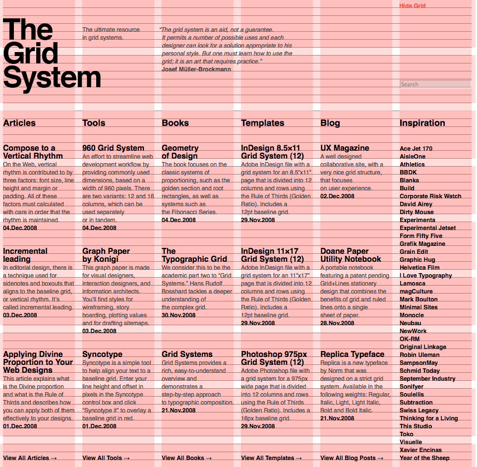 그리드 시스템(Grid System)에서 ‘Grid’는 격자나 바둑판 모양의 눈금을 뜻하며 일반적으로는 수직과 수평으로 면이 분할된 것을 의미합니다. 1970년대 중반부터 본격적으로 사용된 그리드 시스템은 디자인의 레이아웃에 규칙을 부여하는 수단입니다. 편집디자인(인쇄물)에서 시작해 현재 웹 개발 분야에도 적용하여 웹 페이지를 제작하는 기초 단계에서 그리드 시스템을 사용하면 제작을 쉽고 빠르게 진행할 수 있습니다.