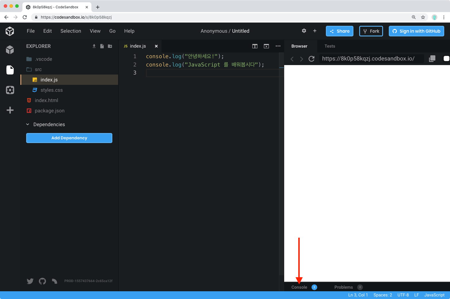 index.js 파일의 내용을 다 지우고 다음 코드를 입력해보세요.
