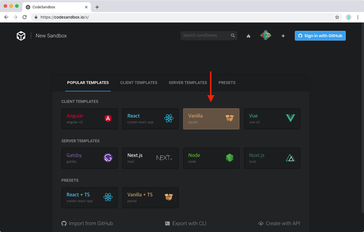 위 링크를 열고 우측 상단의 Create Sandbox 를 누르세요.