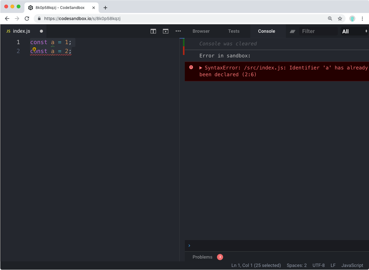 "Error: "a" is read-only" 라는 오류가 발생했습니다. 한번 상수로 선언했으면 값을 바꿀 수 없음을 의미합니다.