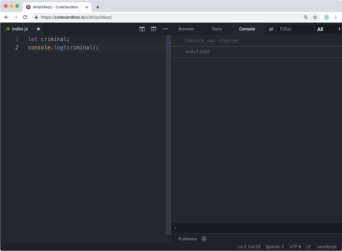 criminal 이라는 변수를 선언하긴 했지만 값을 지정해주지는 않았습니다. 이를 console.log 를 통해 보여주도록 하면 undefined 라는 값이 나타나게 됩니다.