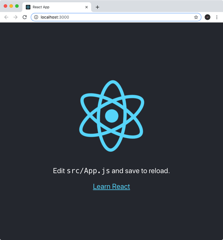 이 명령어를 실행하고 나면 다음과 같이 브라우저에 http://localhost:3000/ 이 열리고, 돌아가는 리액트 아이콘이 보일 것입니다. 자동으로 페이지가 열리지 않는다면 브라우저에 주소를 직접 입력하여 들어가세요.