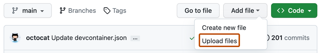 파일 목록 위에서 파일 추가 드롭다운 메뉴를 사용하고 파일 업로드를 선택합니다. 또는 파일을 브라우저로 끌어서 놓을 수 있습니다.