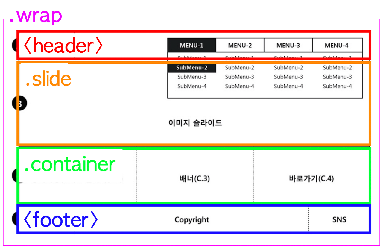 .wrap > header, .slide, .container, footer 가 순서대로 배치되어 있어야 한다.